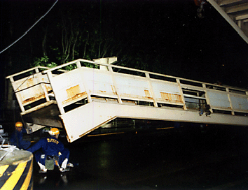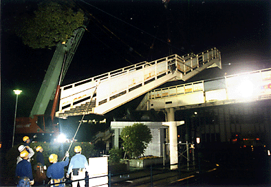 階段は公会堂前公園に駐車したクレーン車からつるされ、車道のトレーラーへ降ろす手はずでした。