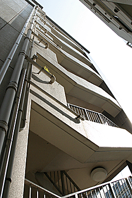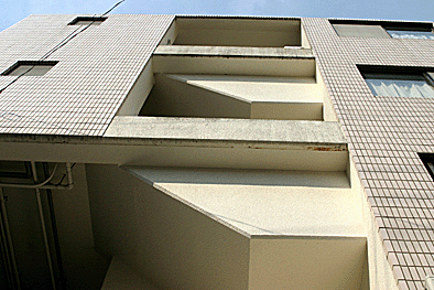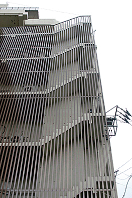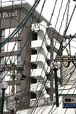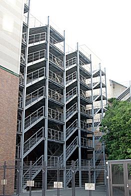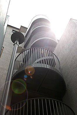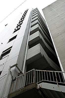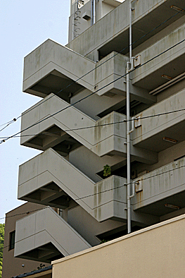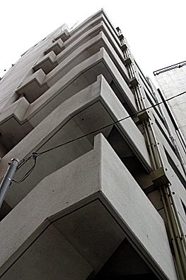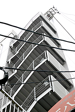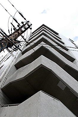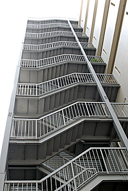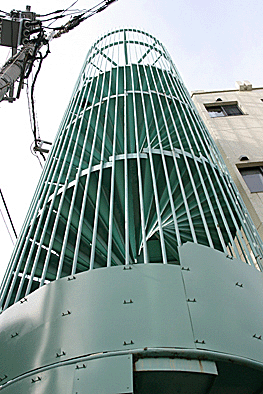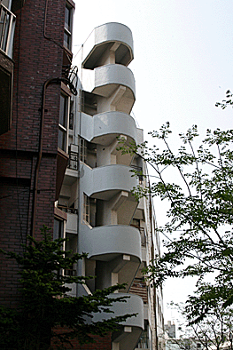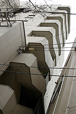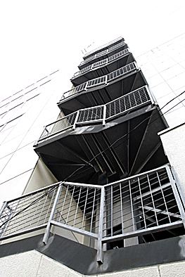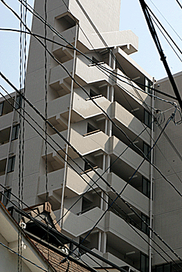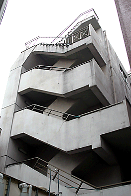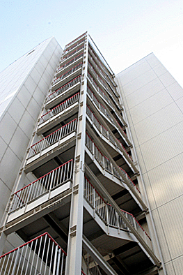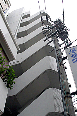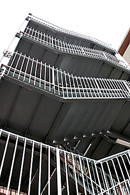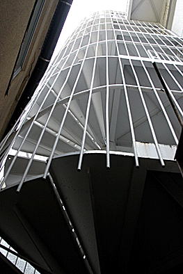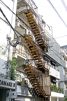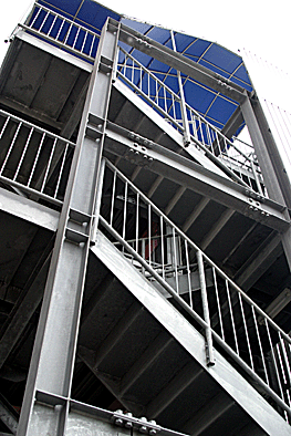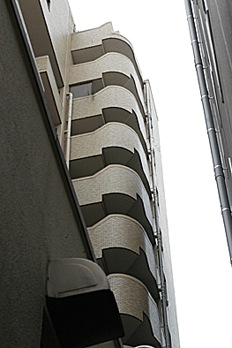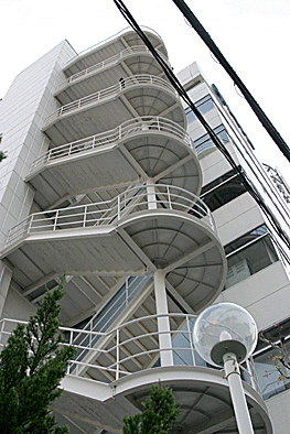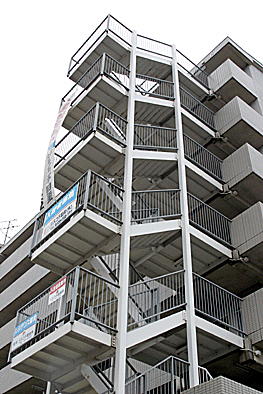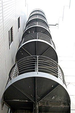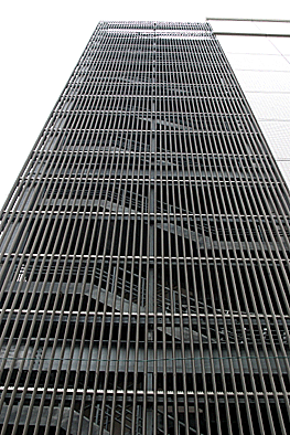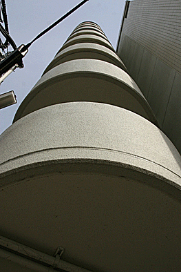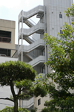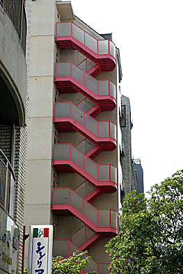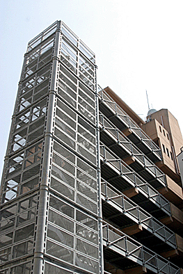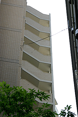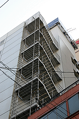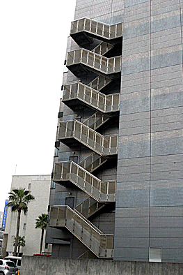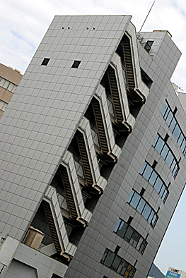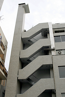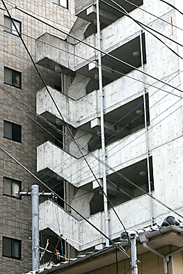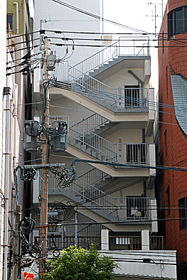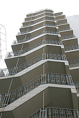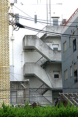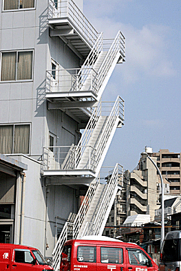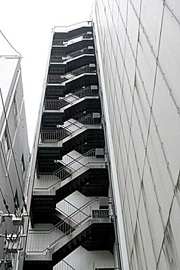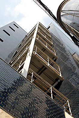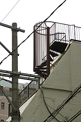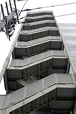 非常階段ではありません。とあるビルの建設現場ですが、メインとなる鉄骨のほかに、作業用足場が天 高く組まれています。階段もついています。高い位 置にあるクレーン操縦室まで、行き来するためのも のでしょうか。バベルの塔を彷彿とさせています。 |