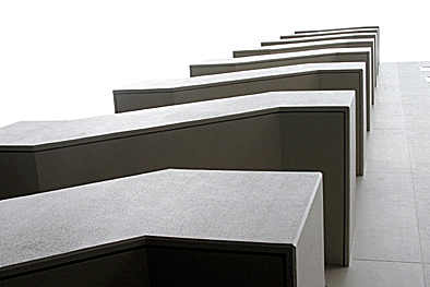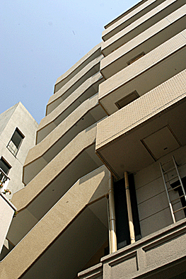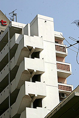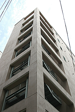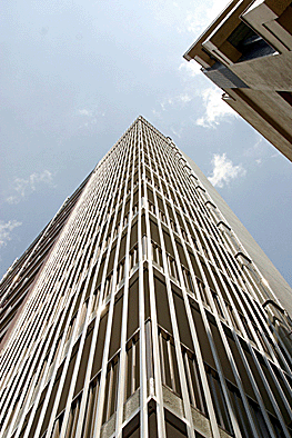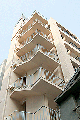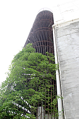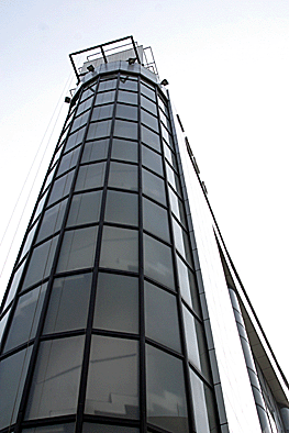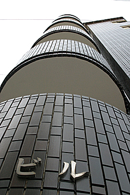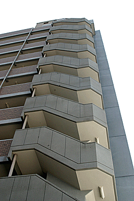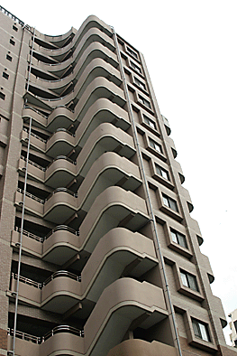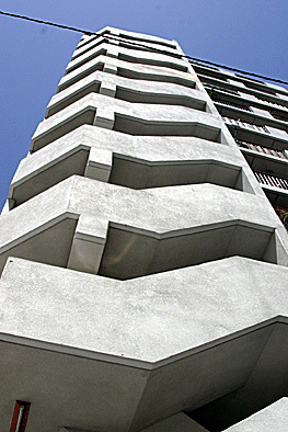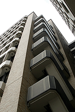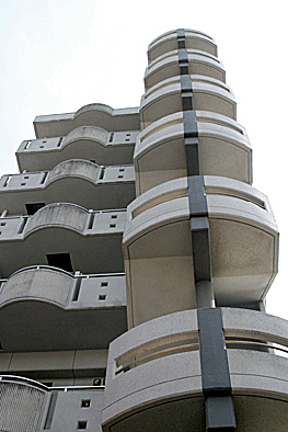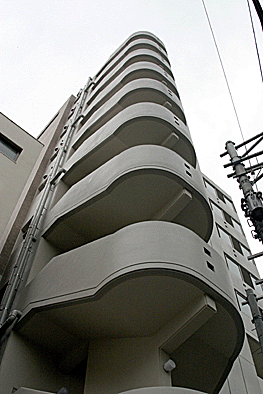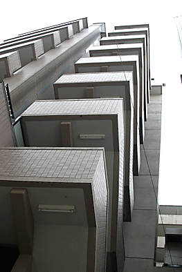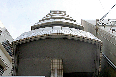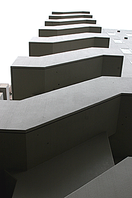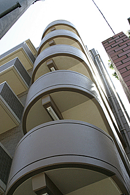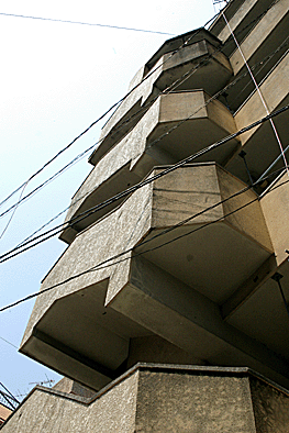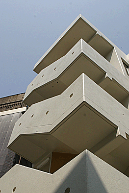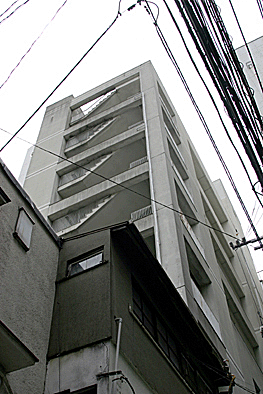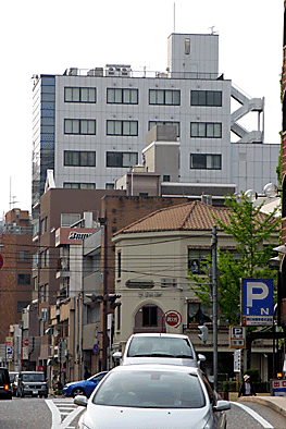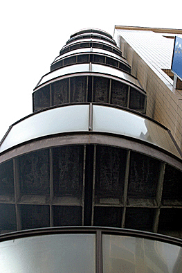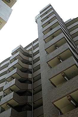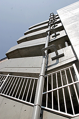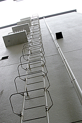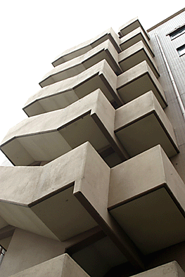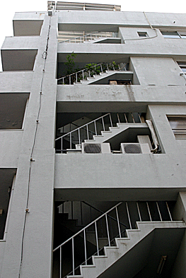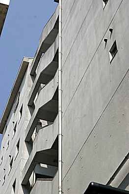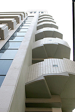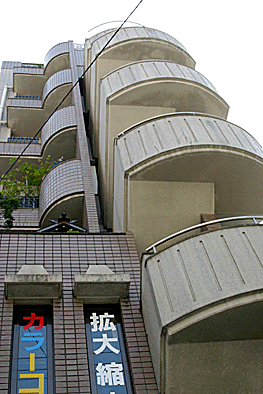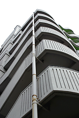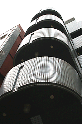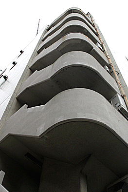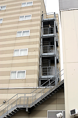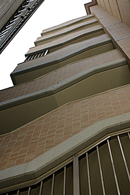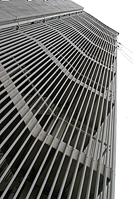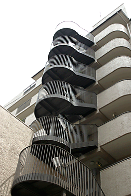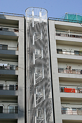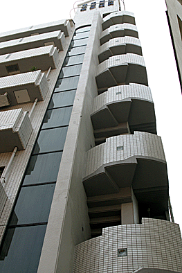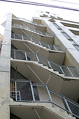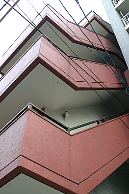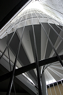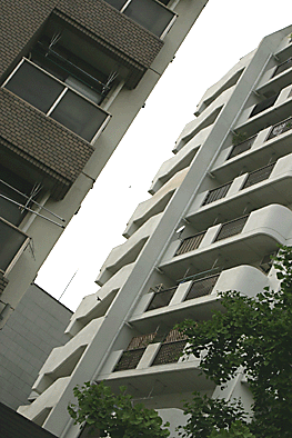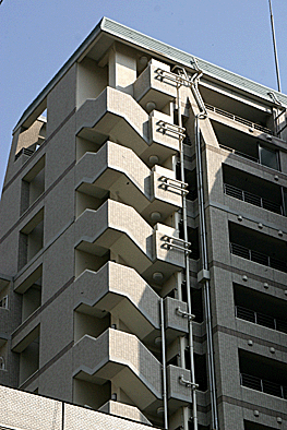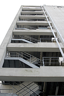 非常階段ではありません。とあるビルの建設現場ですが、メインとなる鉄骨のほかに、作業用足場が天 高く組まれています。階段もついています。高い位 置にあるクレーン操縦室まで、行き来するためのも のでしょうか。バベルの塔を彷彿とさせています。 |